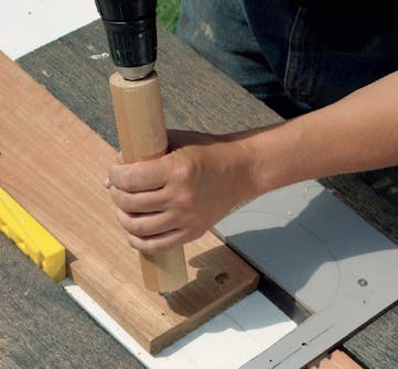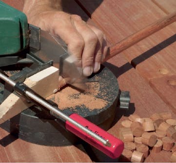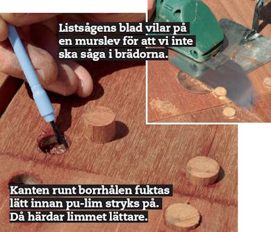 Det ser snyggast ut om alla skruvhål pluggas igen, så det gör vi. Inte nog med att ytan blir hel och fin. Pluggarna gör också att det inte kan samlas vatten ovanför skruvarna, vilket kan leda till rostangrepp och att träet får röta.