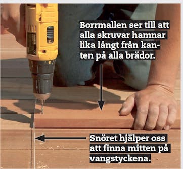 Skruvhålen borras med hjälp av en borrmall, en bräda som är försedd med två borrhål. Dessa har placerats exakt i förhållande till brädans kanter. Mallen läggs på de brädor som ska borras. Ett snöre styr oss mot mitten av vangstyckena