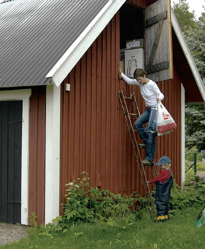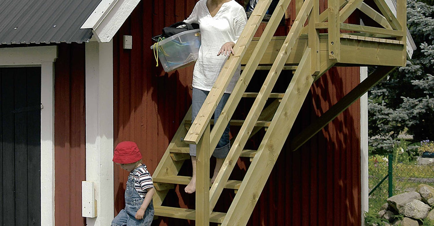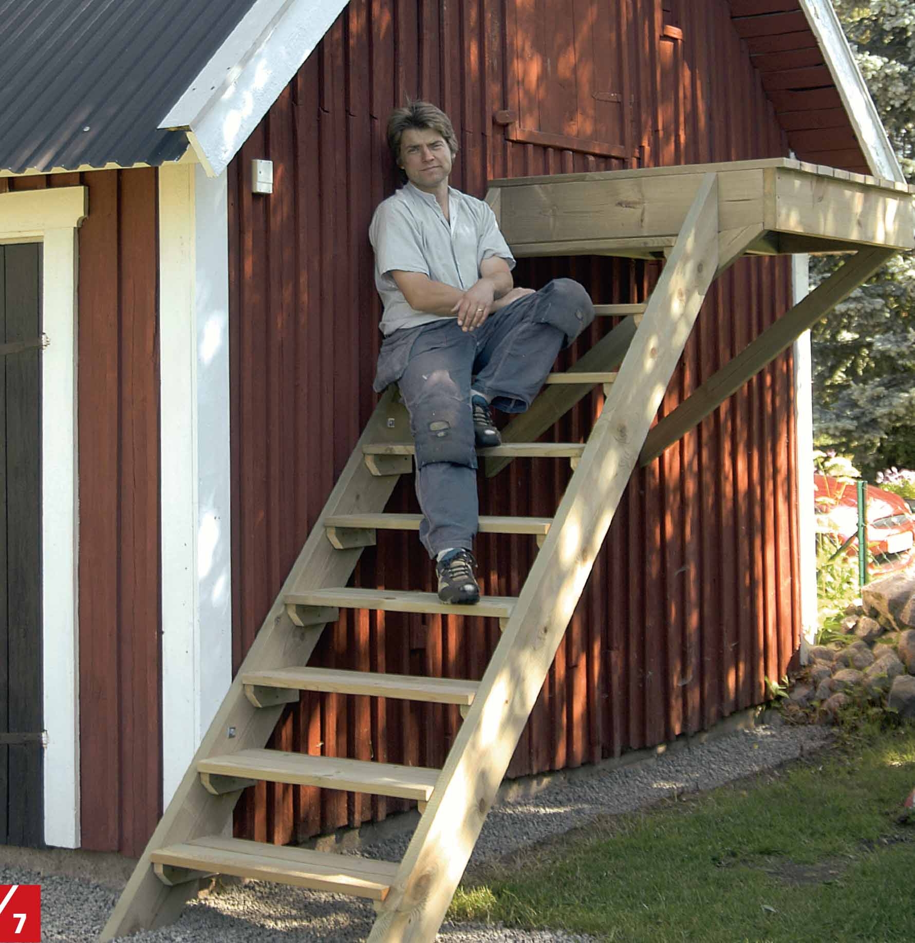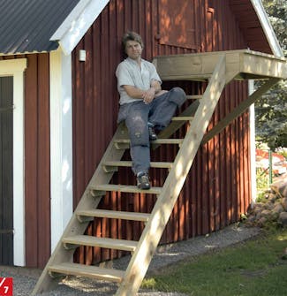 Nu kan trappstegen skruvas fast. Här är varje steg 80 cm brett och det innebär att trappans totalbredd blir 89 cm (vangstyckena är ju 45 mm breda var). Nu kommer det spännande ögonblicket när du kan prova den egenhändigt snickrade trappan. Att gå upp i trappan vållar inga som helst problem, men det är när man går ner som man upptäcker om man borde ha följt trappformeln till punkt och pricka och låtit två steghöjder plus ett plansteg vara exakt 63 cm.