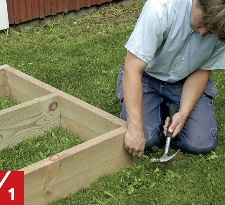 Lägg delarna på marken och spika ihop ramen av reglarna A, B och C med 100 mm varmgalvade spikar. I hörnen skruvar vi kraftiga vinkeljärn som förstärkning för att ramen skall klara den kraftiga belastningen.