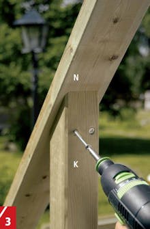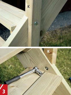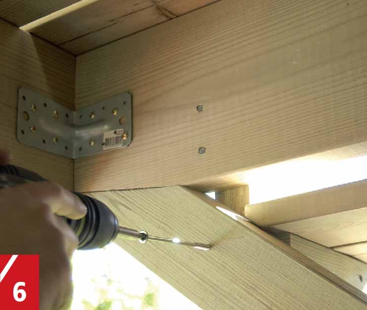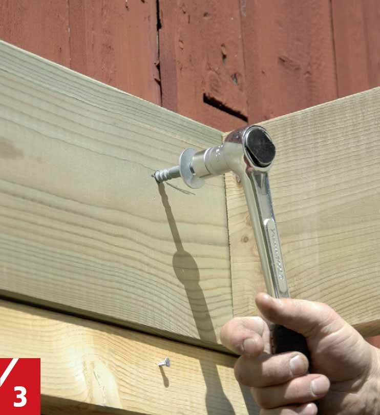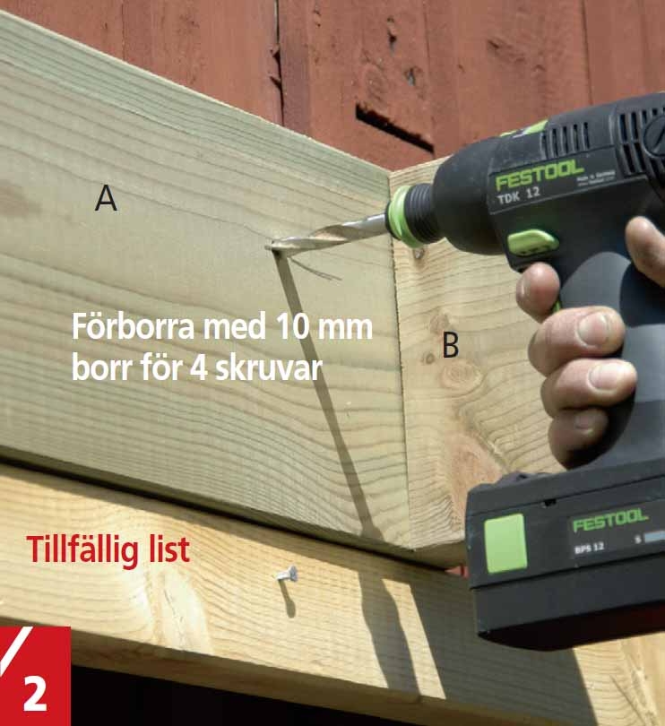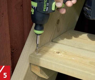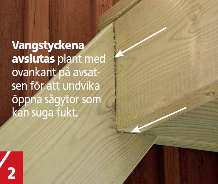 Det yttre vangstycket justeras upp- och nertill tills både övre och nedersta trappsteget är vågrätt. Fäst vangstycket från undersidan och insidan av avsatsen och i snedsträvan med 6 x 120 mm träskruvar i förborrade hål.