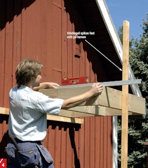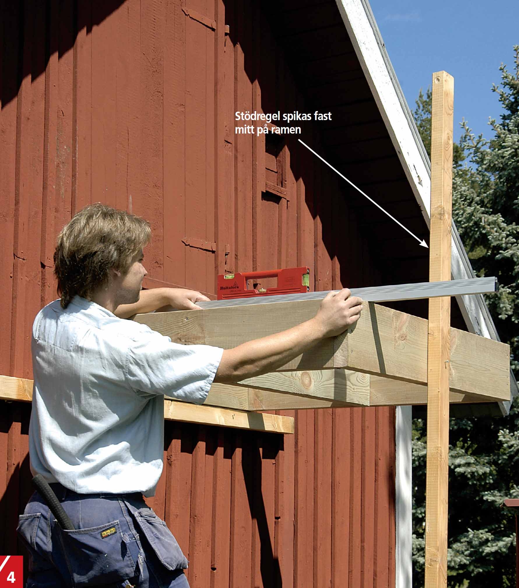 Avsatsen justeras så den blir vågrät och bärs under tiden av en tillfälligt monterad stödregel mitt på den utvändiga sidan. Genom att slå in kilar under regeln kan vi lyfta den precis lagom mycket.