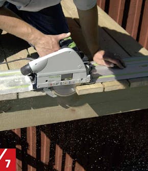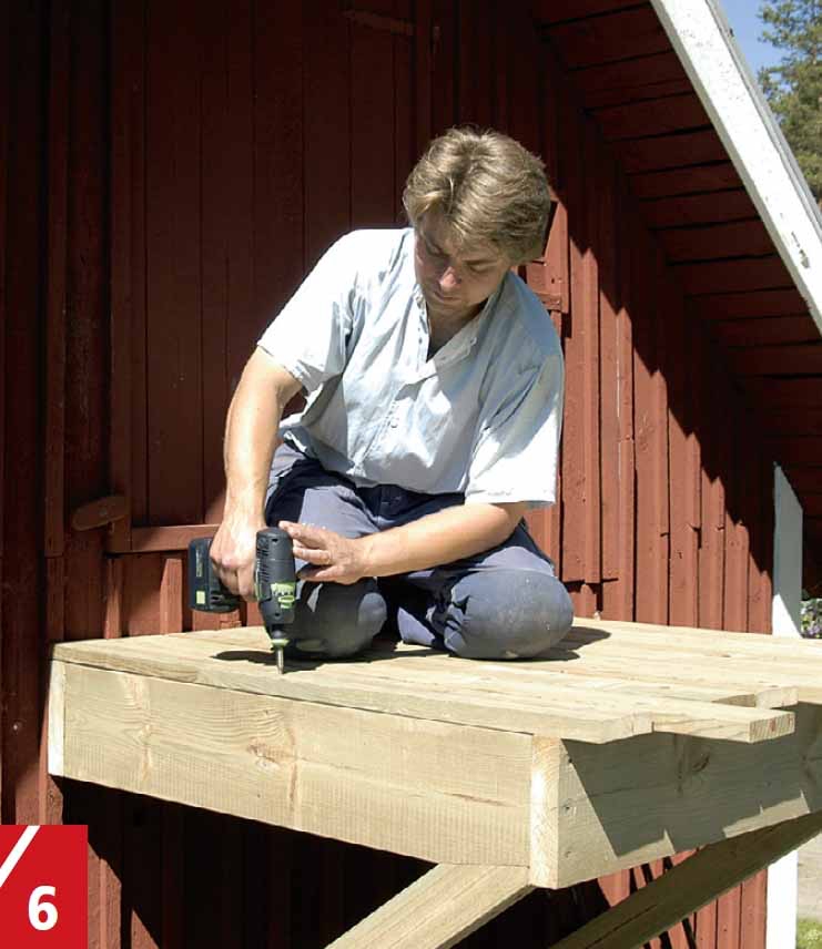 Golvbrädorna (F) skruvas fast på avsatsen med 6 x 70 mm trallskruv. Håll cirka 5 mm luft mellan brädorna. Försök anpassa bredden så att det blir lika stort överallt. OBS! Om virket är mycket fuktigt minskas avståndet eftersom brädorna krymper när de torkar.
