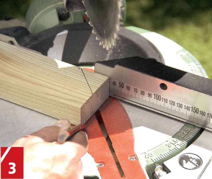 Stolpen klyvsågas nerifrån upp till märket för då kan vi montera den halvvägs in över vangen. Bottnen geringssågas i en vinkel på 45 grader - se även bild 4.