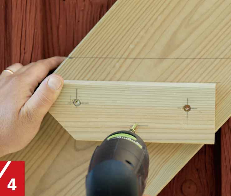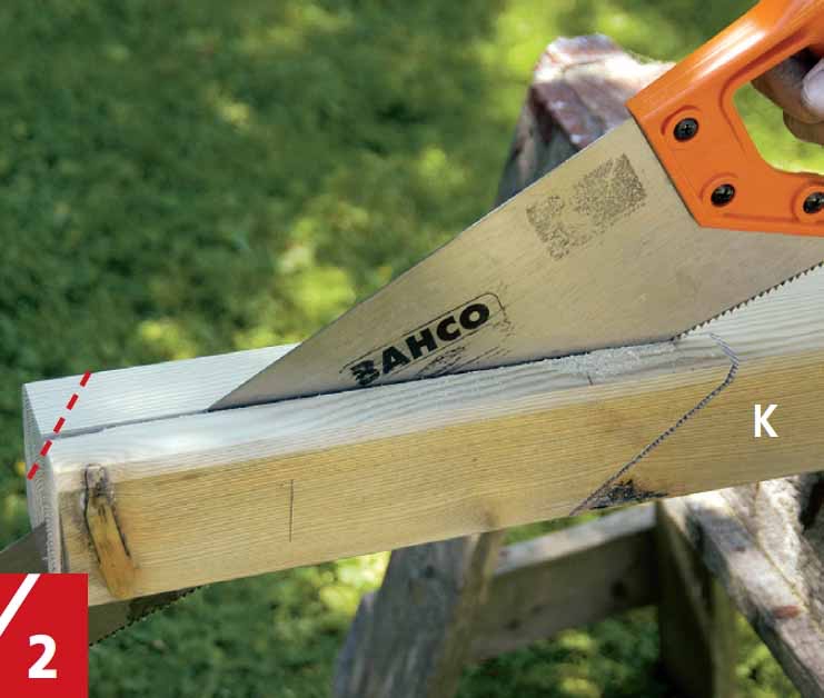 Markera för en liten trekant på de två ytterreglarna (A) och såga bort den med sticksåg. Urtaget blir stöd för snedsträ-vorna (E) som senare monteras under avsatsen.