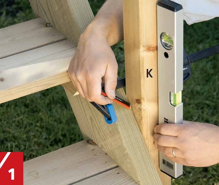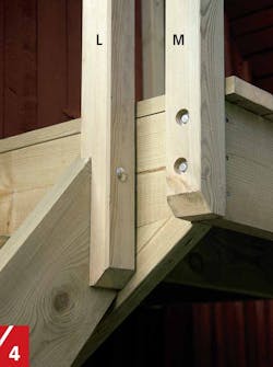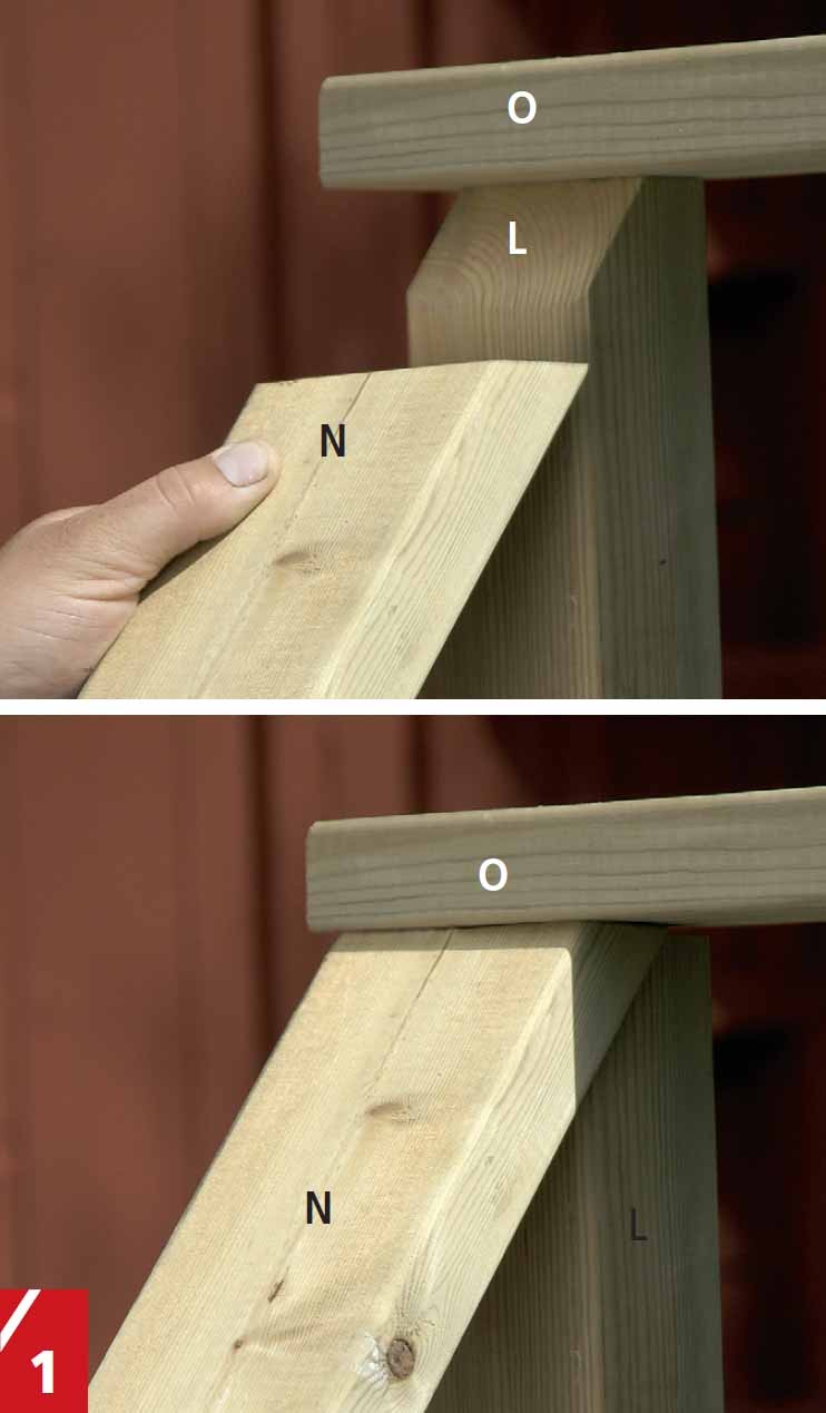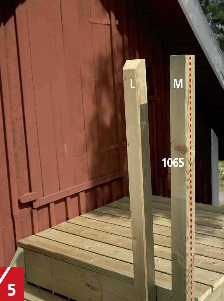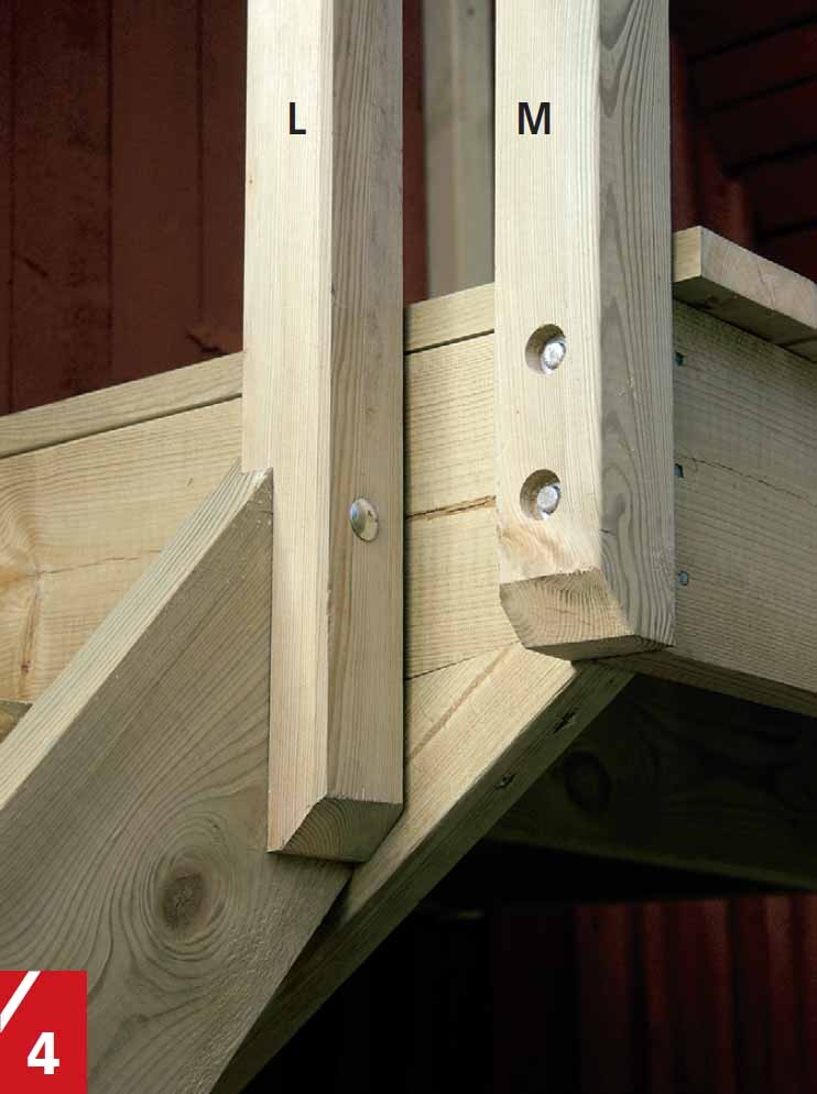 Den övre stolpen (L) sågas till på samma sätt och fästs på steg två, fast uppifrån, och då räknar vi avsatsen som det första steget. Lägg märke till att stolparna fasats av nertill.