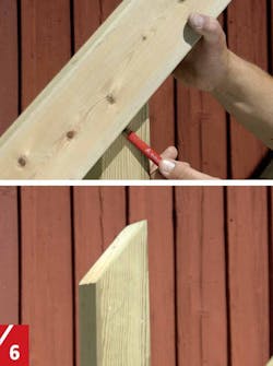 Vinkeln stolpen skall sågas i nertill hittar vi på ungefär samma sätt som när vi fann markvinkeln för vangstyckena. Håll stolpen lodrätt och markera längs vangstycket.