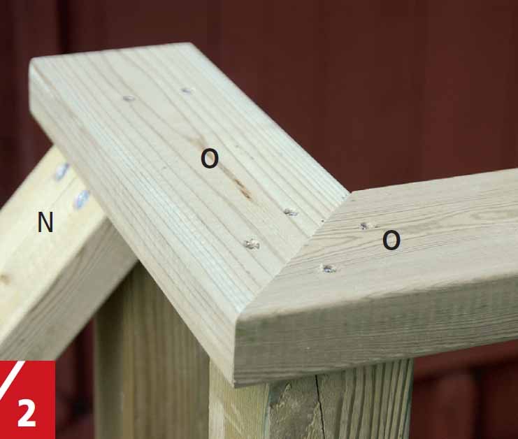 Den vågrätt monterade räckeslisten (O) geringssågas i 45 grader och spikas fast ovanpå stolparna runt avsatsen.