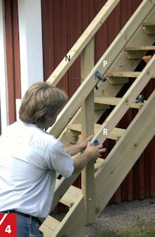 Mellan räckesstolparna i trappan fästs två lister av 45 x 70 mm virke på högkant. Den översta (P) placerar vi här 14 cm under handledaren och den undre (R) fästs ytterligare 26 cm ner. Listerna fästs i stolparna med två 700 skruvar.