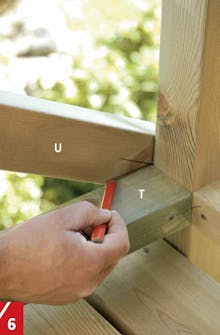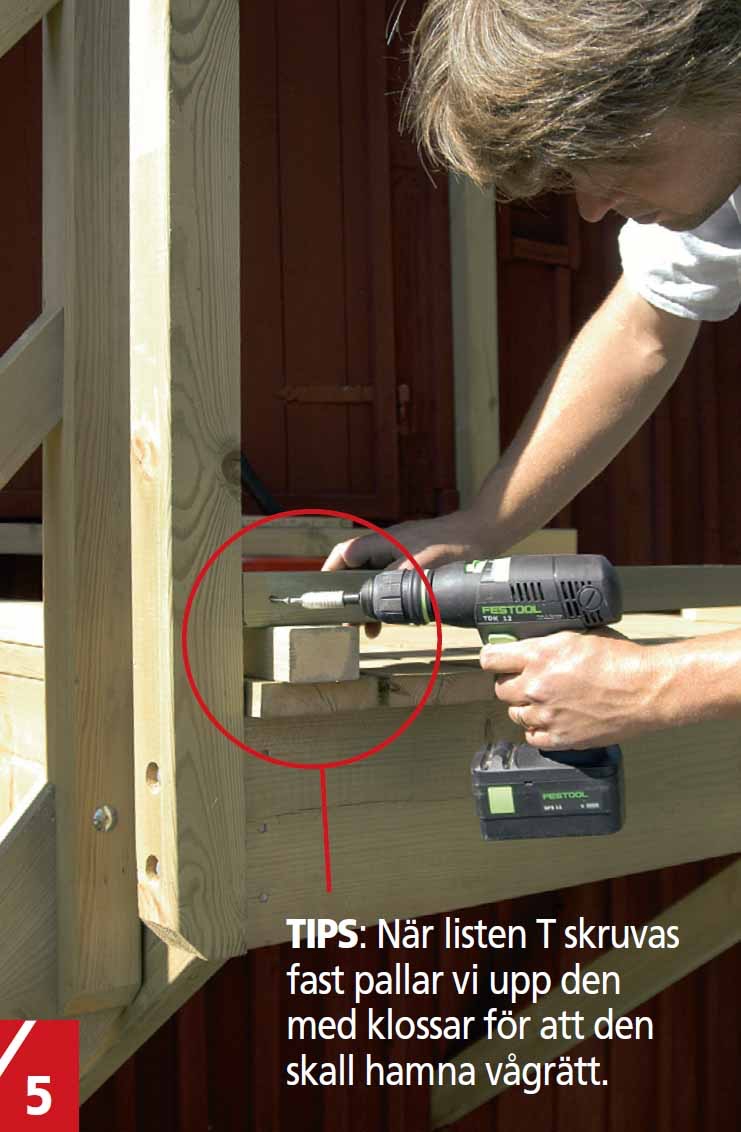 Räcket runt avsatsen kompletteras med ett kryss av reglar. Först fäster vi en vågrätt list (S) på 45 x 70 mm 13 cm under räckets underkant. Ytterligare en list (T) fästs 4,5 cm ovanför golvet. Listerna fästs enklast med 70 mm trallskruv som dras in snett genom stolparna från var sin sida.