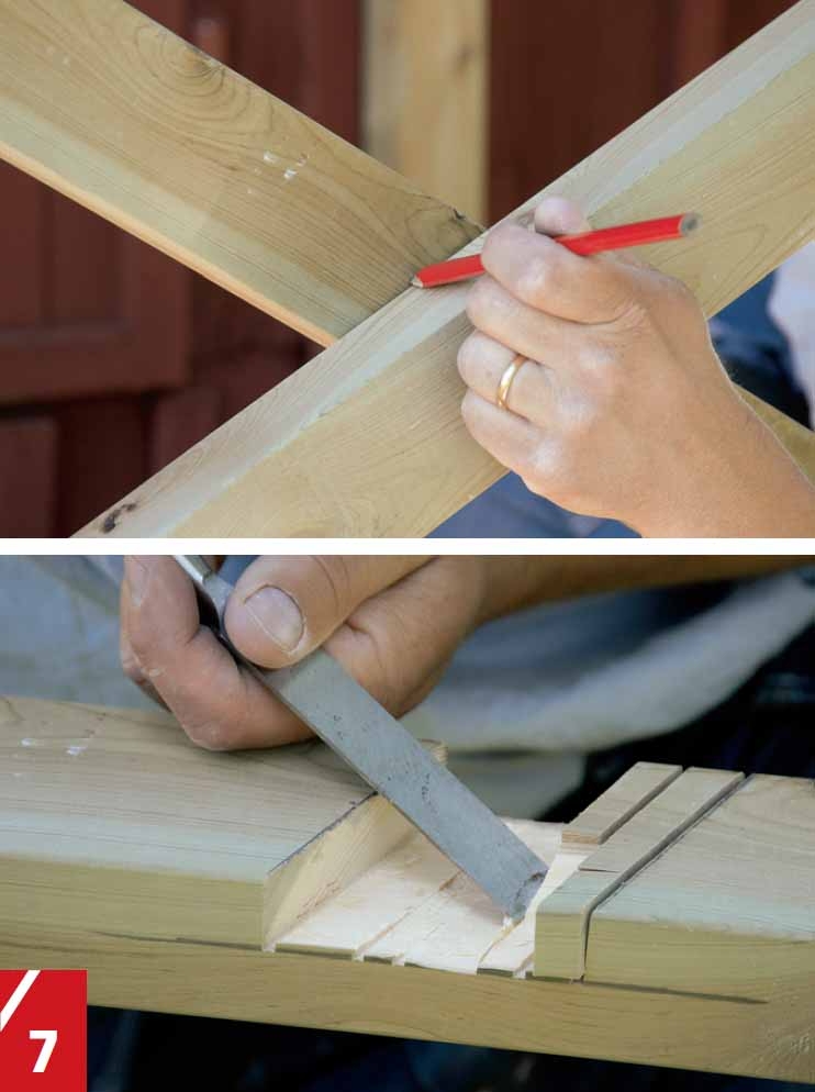 För att få en snygg bladskarv fäster vi reglarna tillfälligt med tvingar och markerar sedan var de överlappar varandra. Därefter skall hälften av regeln stämmas bort vid överlappningen. Det går lättast om man först sågar ett antal spår tätt intill varandra och sedan stämmer bort träet. Lägg ihop reglarna.