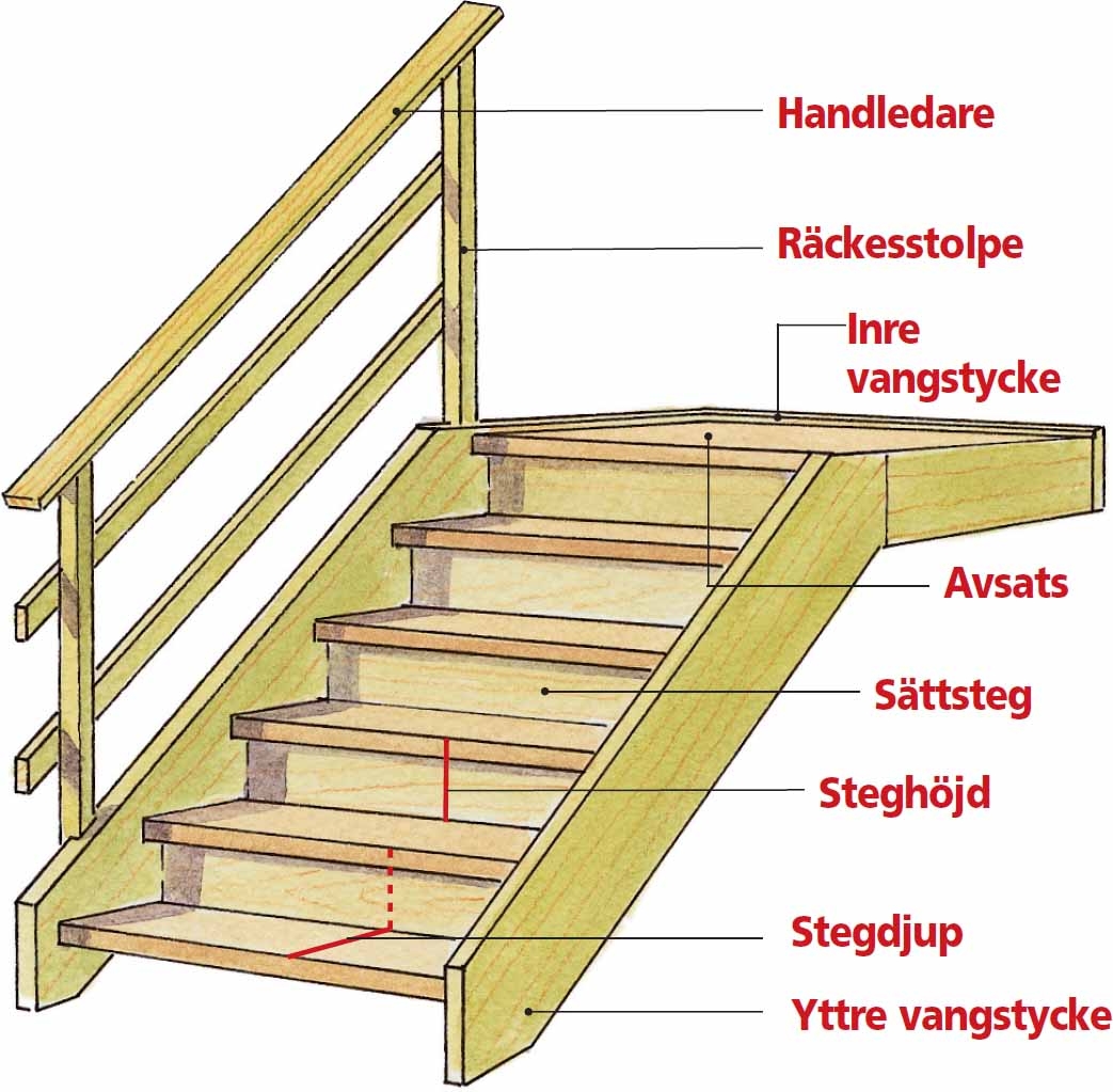 Stolpen skruvas fast på vangstycket i nivå med det andra trappsteget. Använd vagnsbult. Muttern på insidan av vangen försänker vi genom förborra ett hål för den.
