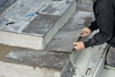 Mät för plattorna på nästa trappsteg. Ska du ha plattor även på sättstegen, ska plattorna på planstegen sticka ut. Med så stora plattor som här, måste du mäta på flera ställen på varje steg, så att plattorna passar i bredd och djup.