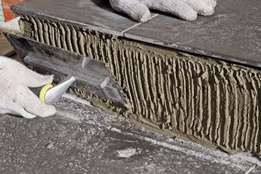 Fördela kakelfix på sättstegen, när du har mätt och skurit plattan. Det kan vara lite kladdigt och för att inte spilla på de lagda plattorna, kan du skydda dem med plast eller papp.
