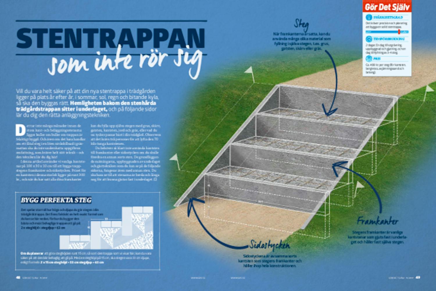 Sidostyckena och stegens framkanter är fastgjutna, och efter ett dygns torktid kan du fylla igen stegen. Du kan använda skärv, grus, sten, jord och gräs eller vad du tycker passar.