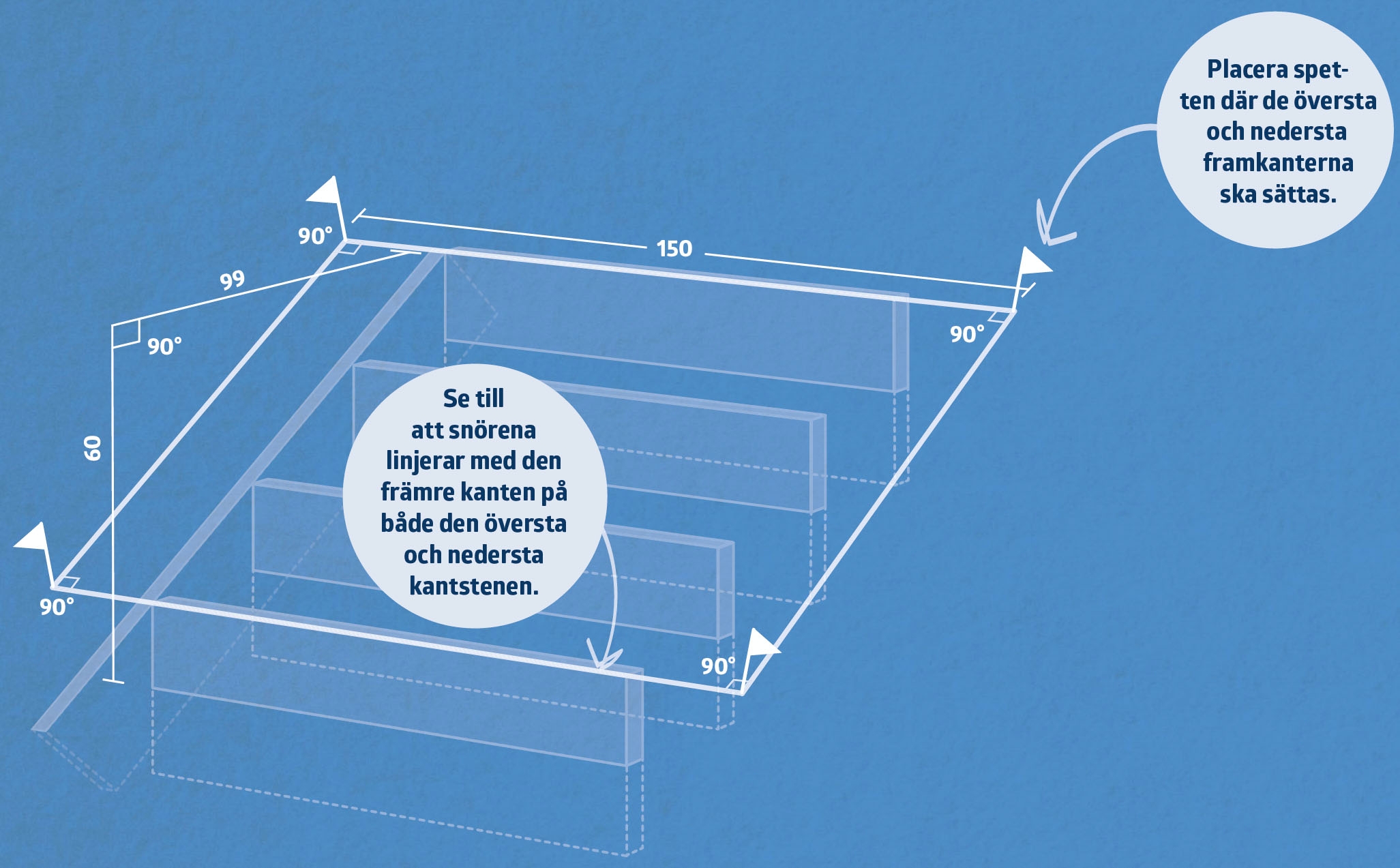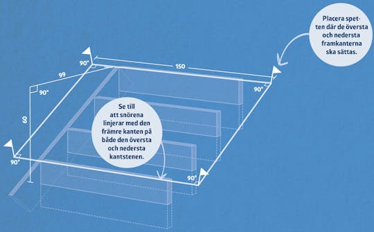 När du har bestämt var din trappa ska placeras, gäller det att mäta upp och sätta en exakt snörmarkering. Här planerar vi för 4 framkanter, vilket ger 3 steg på 33 cm med ett sammanlagt djup på 99 cm och en höjd på 60 cm. Utöver det säkras kanten med 2 sidostycken bestående av 2 kantsten i varje sida.