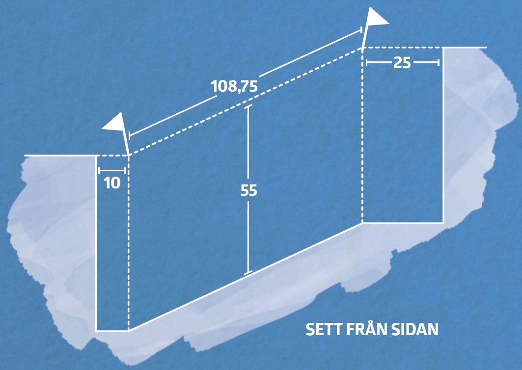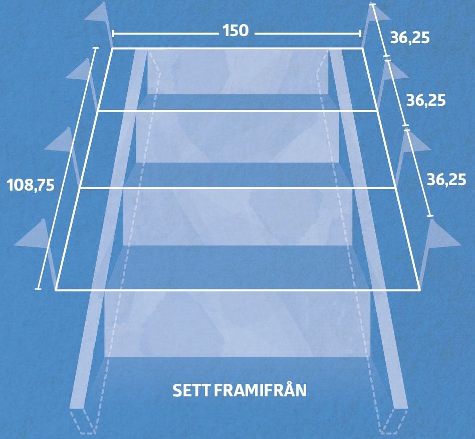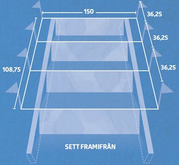 Vi vet redan var den översta och nedersta framkanten ska sättas, alltså vid snörena i toppen och botten. Därför ska de två sista kantstenarna bara fördelas jämnt mellan topp och botten, där den sammanlagda längden är 108,75 cm. Vi avslutar med att sätta nya spett och markeringssnöre för var 36,25 cm. Se till att snörena är i 90 graders vinkel och vågräta i förhållande till de första snörena.