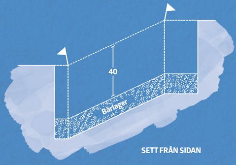 Du har grävt ned till 55 cm under markeringssnöret, och nu ska du lägga bärlagret av 15 cm komprimerad bergkross tills du kommer upp till 40 cm under snöret (mätt lodrätt).