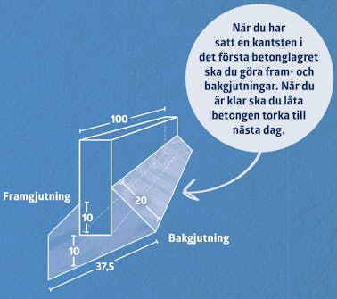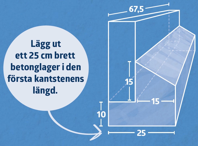 Betonglagret under stenarna, båda sidostycken och framkanter, ska vara 10 cm tjockt. Börja därför med att lägga ett 12 cm lager – när du sätter stenarna sjunker de ca. 2 cm, och då går det ihop.