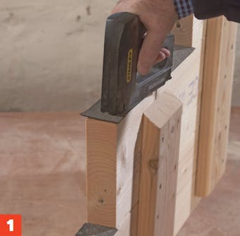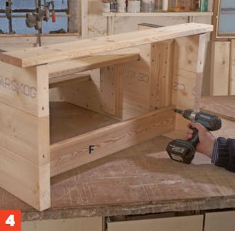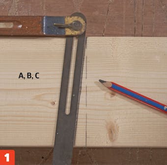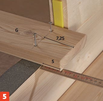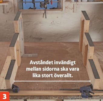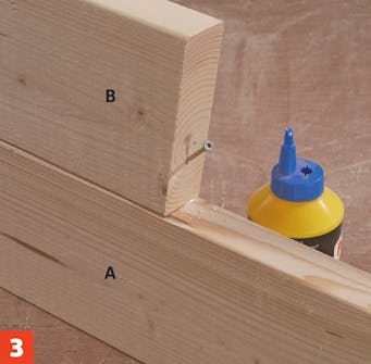 Lägg en sträng utelim på den undre regeln och lägg nästa regel i limmet. Fixera delarna med en snedställd skruv i framkant och en i bakkant.