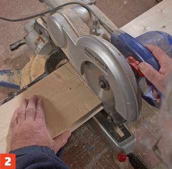 Såga i det snedställda strecket och kapa delarna vinkelrätt i den andra änden (den bakre) så att de får rätt längd. Här är det praktiskt med en kap- och geringssåg.