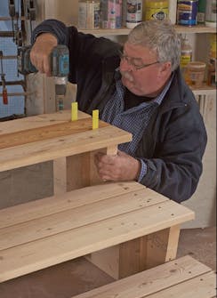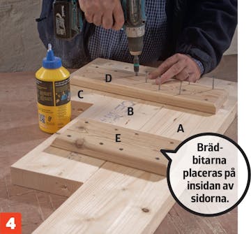 Du ska sedan borra två hål i varje bräda till stegen, 7,25 cm från kortändarna. Kom ihåg att vända kärnsidan uppåt på brädorna. När du ser ådringen på kortänden ska årsringarna ”le” åt dig. Annars kan träet slå sig.