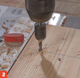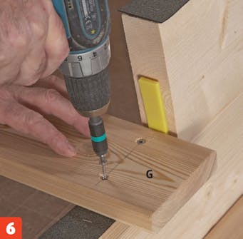 Förborra med 5 mm borr genom stegen G och ner i vangstyckena. Borrhålen ska göra det möjligt att försänka skruvhuvudena. De får inte dras ner för djupt för då samlas det lätt vatten i hålet ovanför dem.
