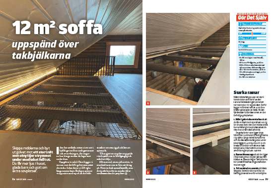 De golvplankor som ligger längs hålet mitt i rummet är tillräckligt starka i sig själva. Längs de två kortsidorna och den återstående långsidan under taket lägger vi 4 cm tjocka och 15 cm breda furubrädor som skruvas fast i takbjälkarna. Alternativt kan kan du använda reglar på 45 x 145 mm.