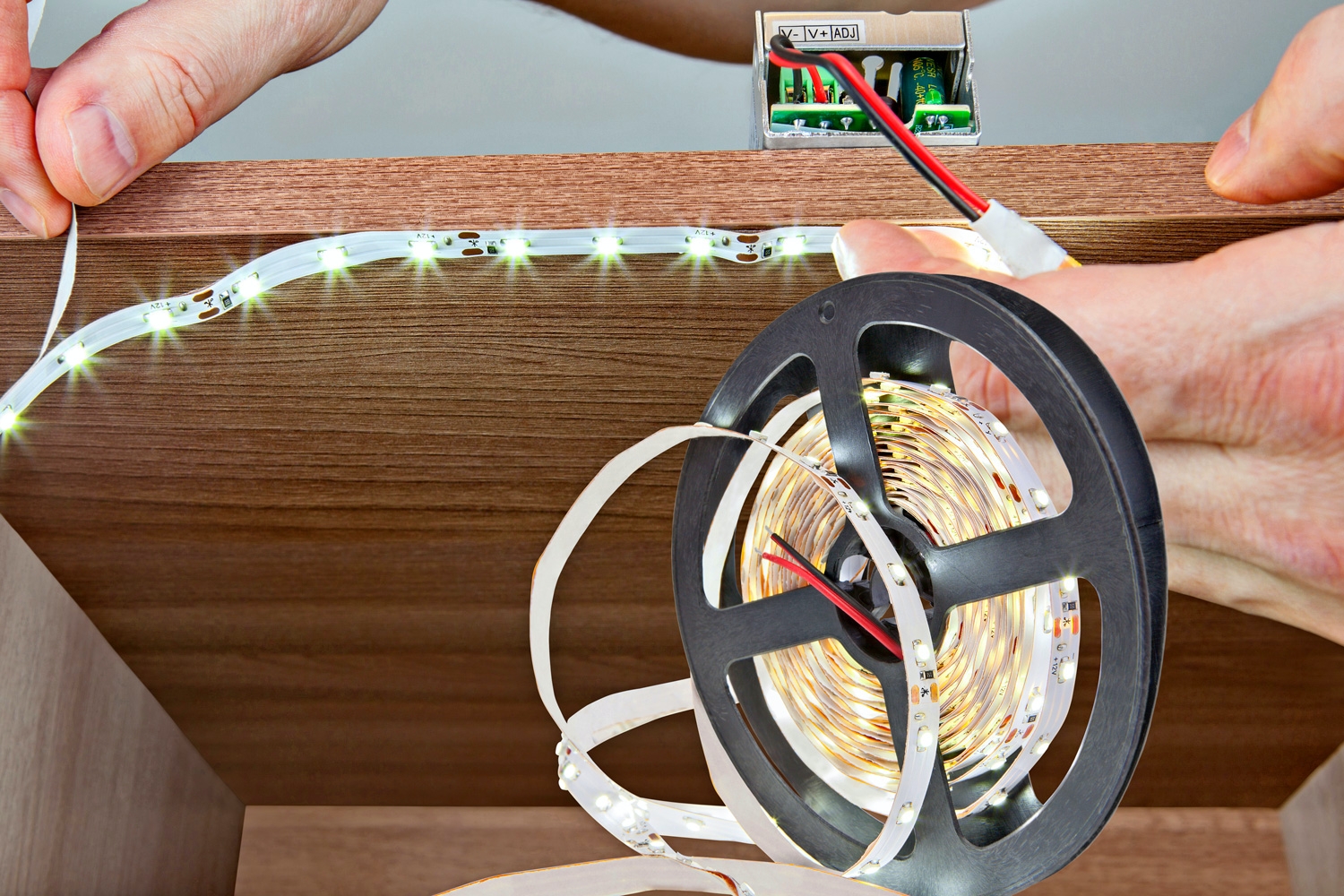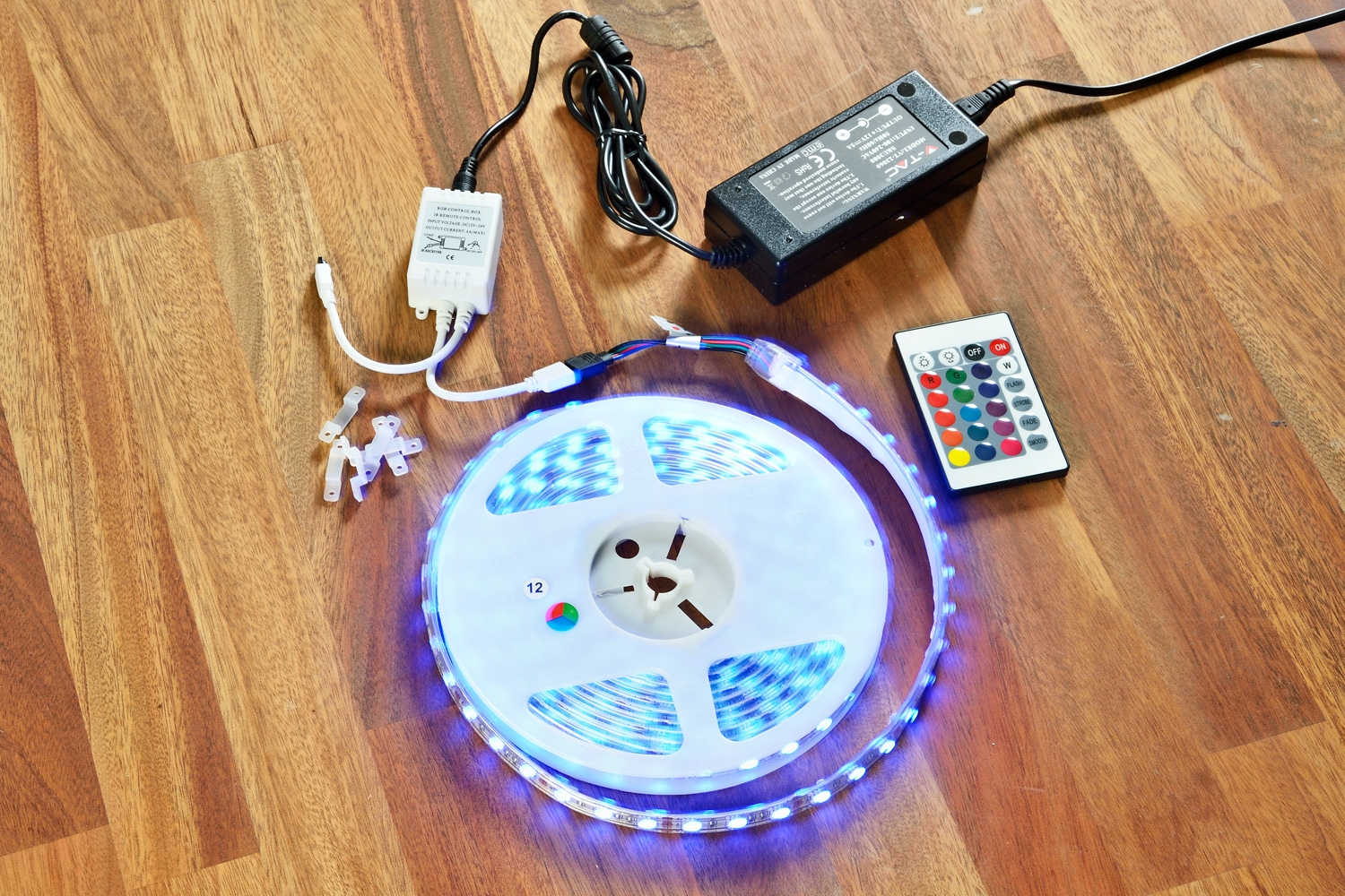 1. LED-lister kan köpas på de flesta byggmarknader och överallt på nätet. Ett paket består ofta av självhäftande LED-kabel upprullad på en spole, en transformator, en mottagare och en fjärrkontroll.