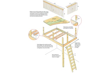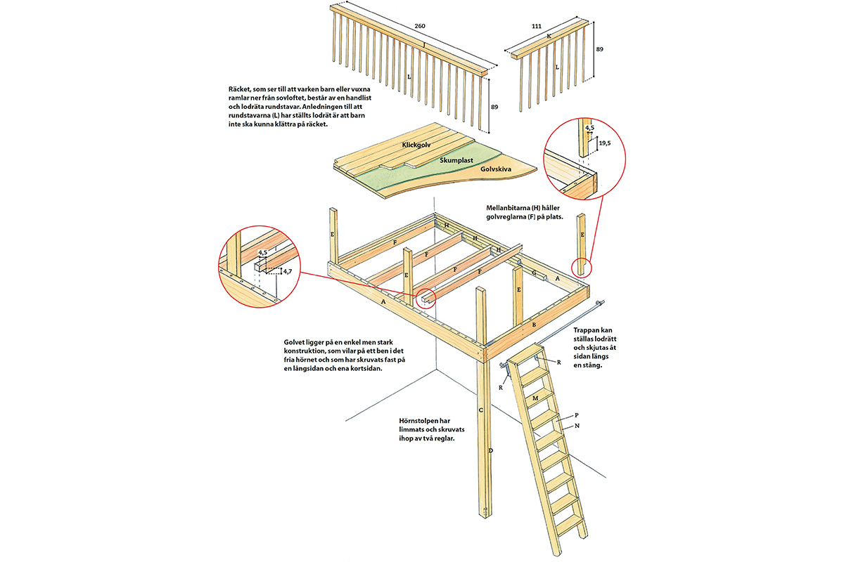 Fäst handlisterna (J och K) på stolparna (E) med lim och skruvar. Runda av kortändarna och alla kanter på handlisterna med slippapper.