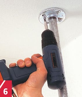 Sätt ihop det översta röret och garderobsstången med en T-koppling och skruva fast flänsen på den övre stången, ev. med hjälp av ett handtag som gör att det går fort.