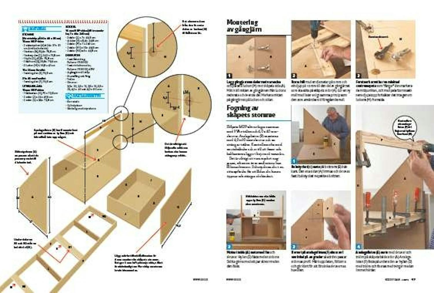 Skåpets MDF-skivor fogas samman med PVAc-trälim och 4,0 x 40 mm-skruvar. Anslagslisten (F) monteras med 4,0 x 60 mm-skruvar och en sträng av trälim. Kontrollera ofta med en vinkelhake och se till att fram- och bakkanterna ligger i linje med varandra.