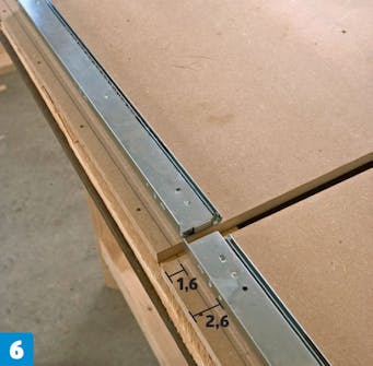 Borrmallen som används för att få en exakt montering av expansionsbeslagen tillverkas av två lister på 50 x 1,5 x 1,5 cm och en 4 mm bit kryssfaner på 8 x 50 cm. Listdelarna ska bilda anslag mot sidornas botten.