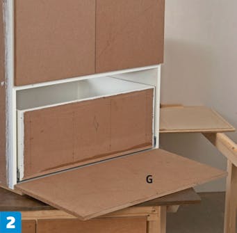 Förse lådfronten (G) med ett par strängar trälim och fixera den på utdragslådan med ett par tillfälliga skruvar. Hålen spacklas innan den målas.