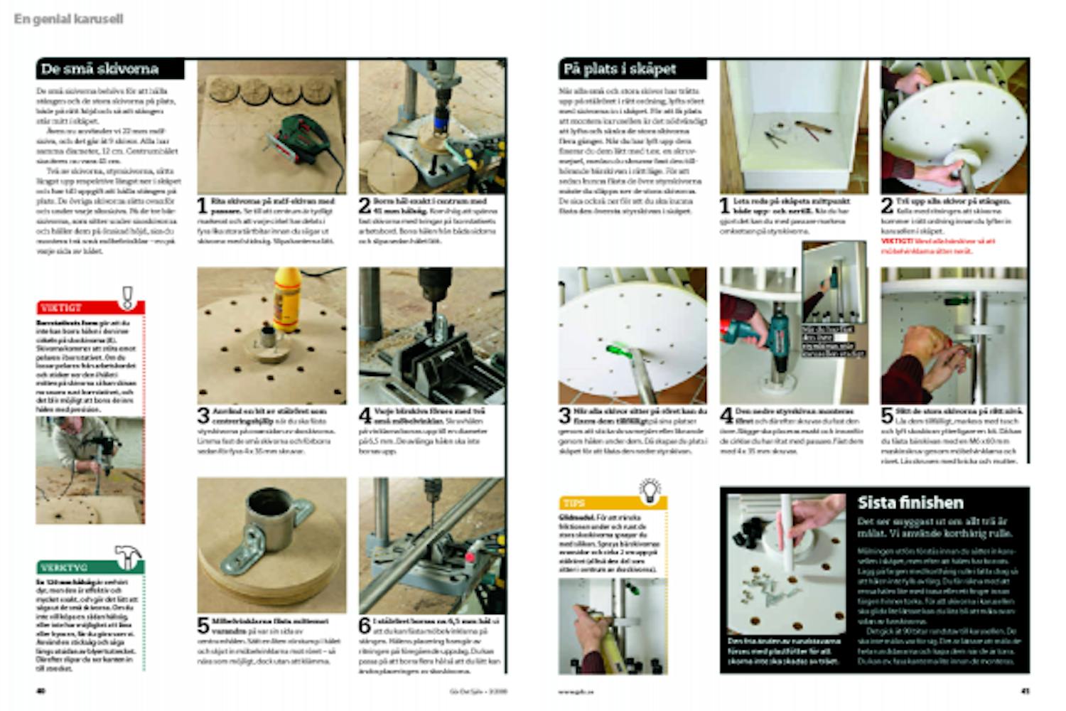 Skokarusellen har tillverkats av 22 mm mdf-skiva. Hållarna görs av 22 mm rundstav och skoskivorna snurrar runt en 40 mm stång av stålrör.
