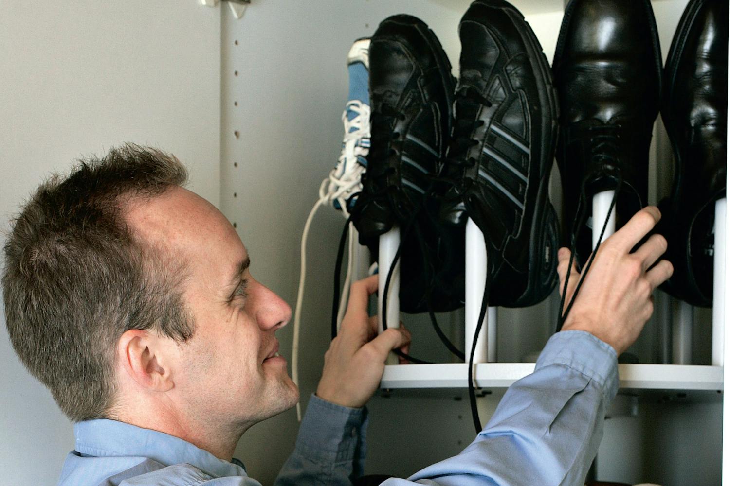För att utnyttja platsen i skåpet effektivt gör vi två typer av skivor. Tre av dem delas upp så att det får plats 12 par skor på varje, medan den fjärde skivan delas upp för att rymma 9 par skor i större storlekar (38 och uppåt).