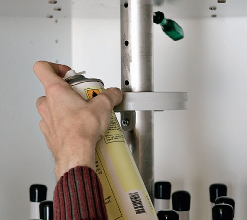 När alla skivor sitter på röret kan du fixera dem tillfälligt på sina platser genom att sticka skruvmejsler eller liknande genom hålen under dem. Då skapar du plats i skåpet för att fästa den nedre styrskivan.