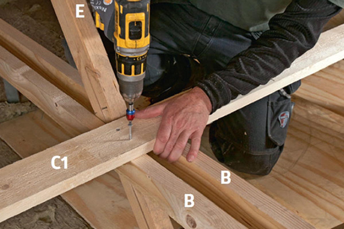 Det första lagret brädor (C1) fäster du med 2 stk. 4,5 x 60 mm skruvar i varje regel (B). Sätt en i änden av reglarna (B) och en mitt i. Det ska bara ge stöd, så se till att du kommer åt att arbeta.