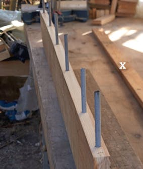 Snickra och sätt upp ett stöd för pinnbultarna så att de är vågräta när du har stuckit in dem i hålen. Kolla att alla pinnbultar sitter vågrätt och ta sedan ut dem.