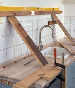 Borra 10 cm djupa hål i hyllans bakre kant för de pinnbultar som sak bära hyllan. Borra genom en bräda X, som har skruvats fast. Brädan ska senare användas som borrmall på väggen.