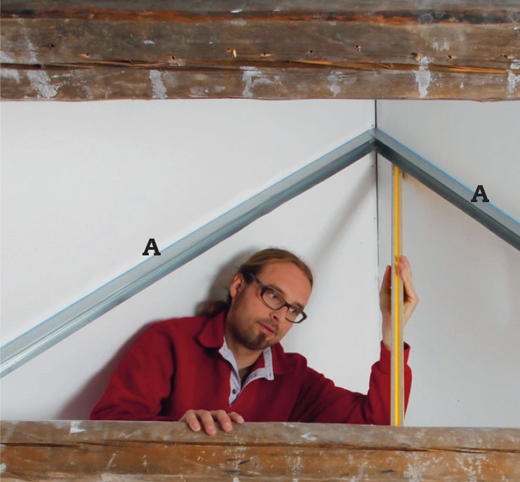 Ramen runt den trekantiga gaveln görs av väggprofiler A. Först skruvar vi fast en profil ovanpå hanbjälken och därefter fäster vi prof iler på snedtaket rakt ovanför.