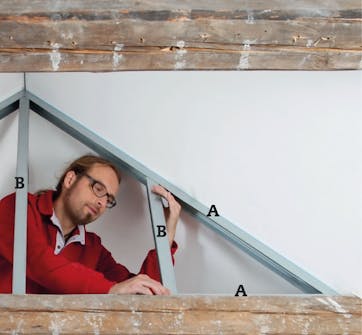 Vi börjar med att sätta upp ramen runt den långa mellanväggen mitt i rummet. Med tanke på att den ska dela utrymmet i två lika stora delar bör den placeras lodrätt under nocken. Men eftersom väggen inte ska dras upp till nocken tar vi oss friheten att placera den så att den följer golvbrädorna, vilket också blir snyggast.