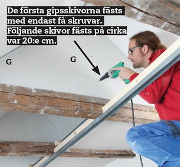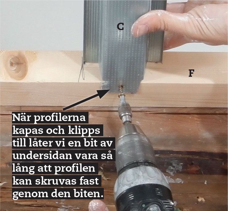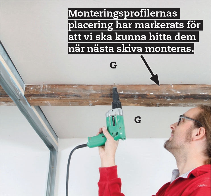 De innersta gipsskivorna G skruvas fast under loftet. Även nu med en 5-7 mm bred fog hela vägen runt för att vi sedan ska kunna skapa en ljudtät fog. De fästs med några få gipsskruvar.