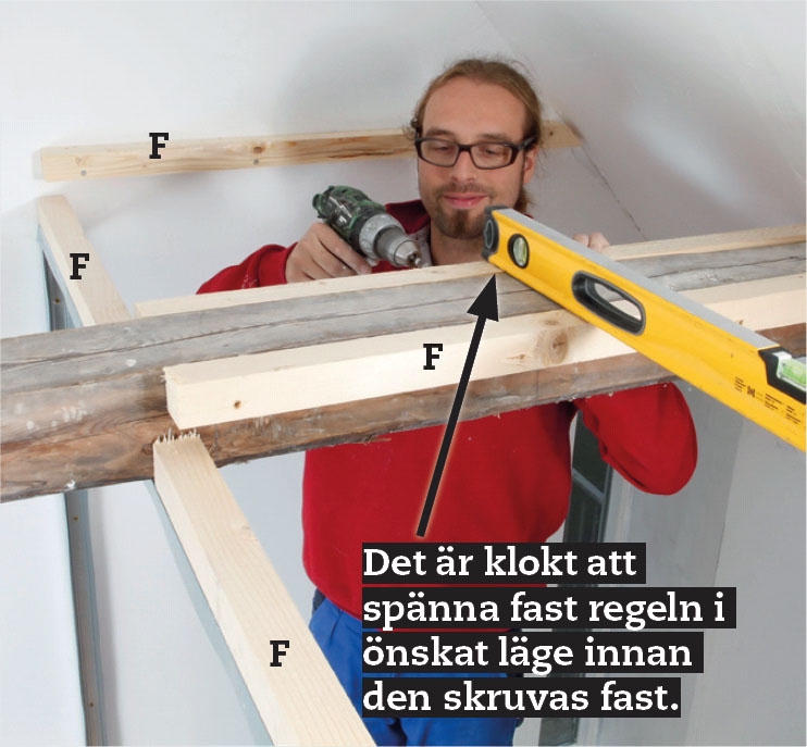 Nu skapar vi ett vågrätt plan till loftet genom att fästa träreglar på sidorna. Vi letar reda på den högsta punkten på hanbjälkarna och utgår från den. Reglarna fästs vågrätt med 5 x 80 mm skruvar och på samma nivå.