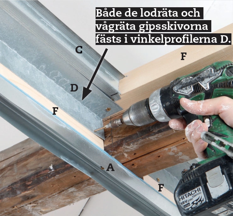 Träregeln Foch stålprofilen C har här samma funktion - att bära upp gipsskivan längs kanten.