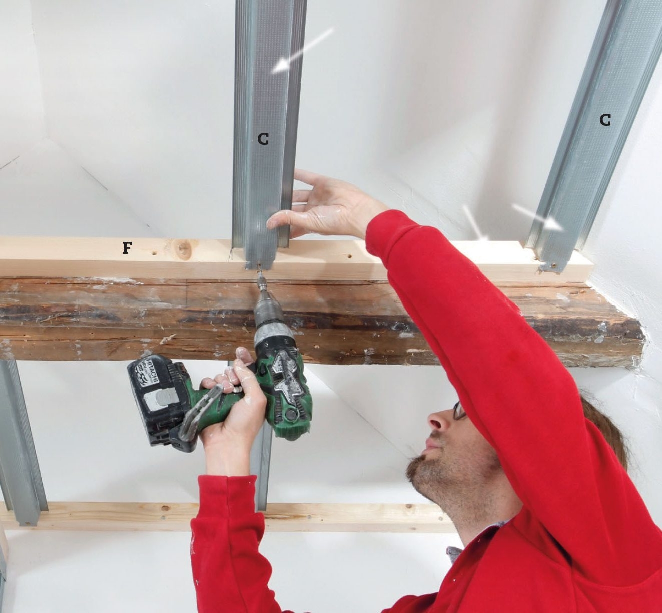Först förhöjer vi den övre delen av stålramen. Vi sågar till träreglar F så att de passar mellan hanbjälkarna. Reglarna fästs på väggprofilerna A med gipsskruvar genom profilerna.