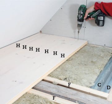 För att få en enkel konstruktion fäster vi 45 mm reglar på sidan av hanbjälkarna. På ovansidan av reglarna läggs golvet och på undersidan fäster vi gipsskivorna som utgör innertak.