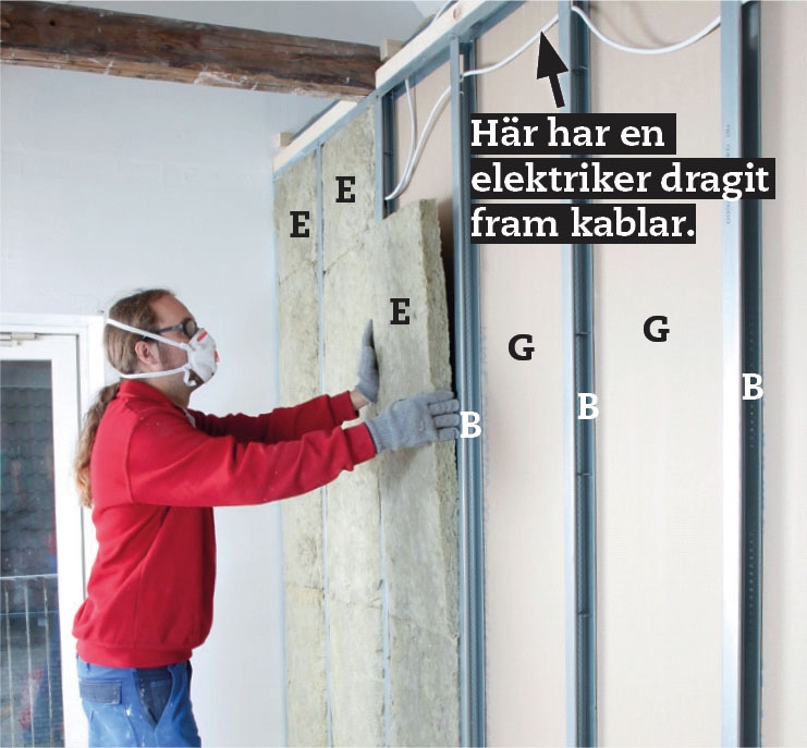 Längs väggarna och på golvet sitter profilerna redan fast, så nu ska vi bara montera lodräta stålreglar på var 45:e cm. Därefter monterar vi gipsskivor på ena sidan, sätter upp isolering och avslutar med gipsskivor på den andra sidan.