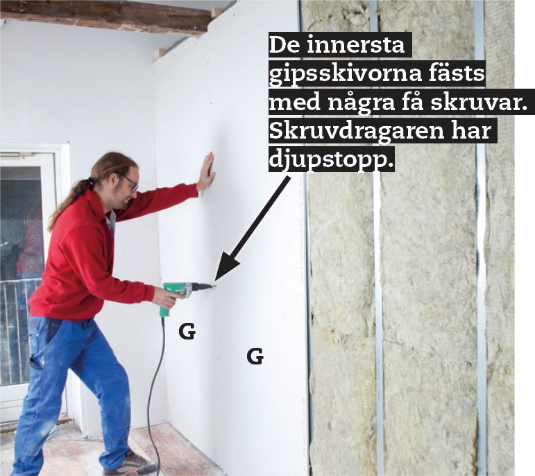 Vi tätar med akrylfogmassa mellan gipsskivor G och bjälkar och sätt upp de yttre gipsskivorna. De skärs till så att de sitter så tätt som möjligt mot hanbjälkarna så att fogningen minimeras. Skruvarna drar vi i på var 20:e cm.