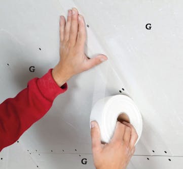 Skarvarna mellan skivorna armeras innan vi spacklar. Målare väljer pappersremsor, men glasfibertejpen är utmärkt om man inte är så van. Den ska sättas upp innan man spacklar. Papperet trycks ner i fuktig spackelmassa.